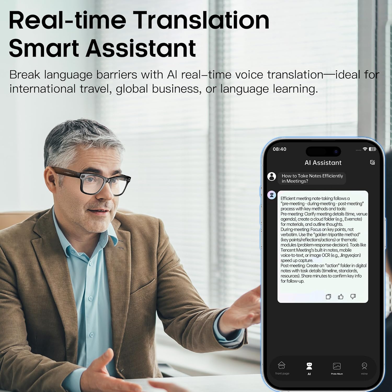 Shoot crisp photos and smooth HD video straight from your glasses while the lenses auto-tint outdoors for UV protection. Stay connected with Bluetooth calls and music, tap to translate conversations in 160+ languages, and share quickly over Wi-Fi. At just 35 g with intuitive touch controls, they’re made for travel, cycling, and everyday adventures.